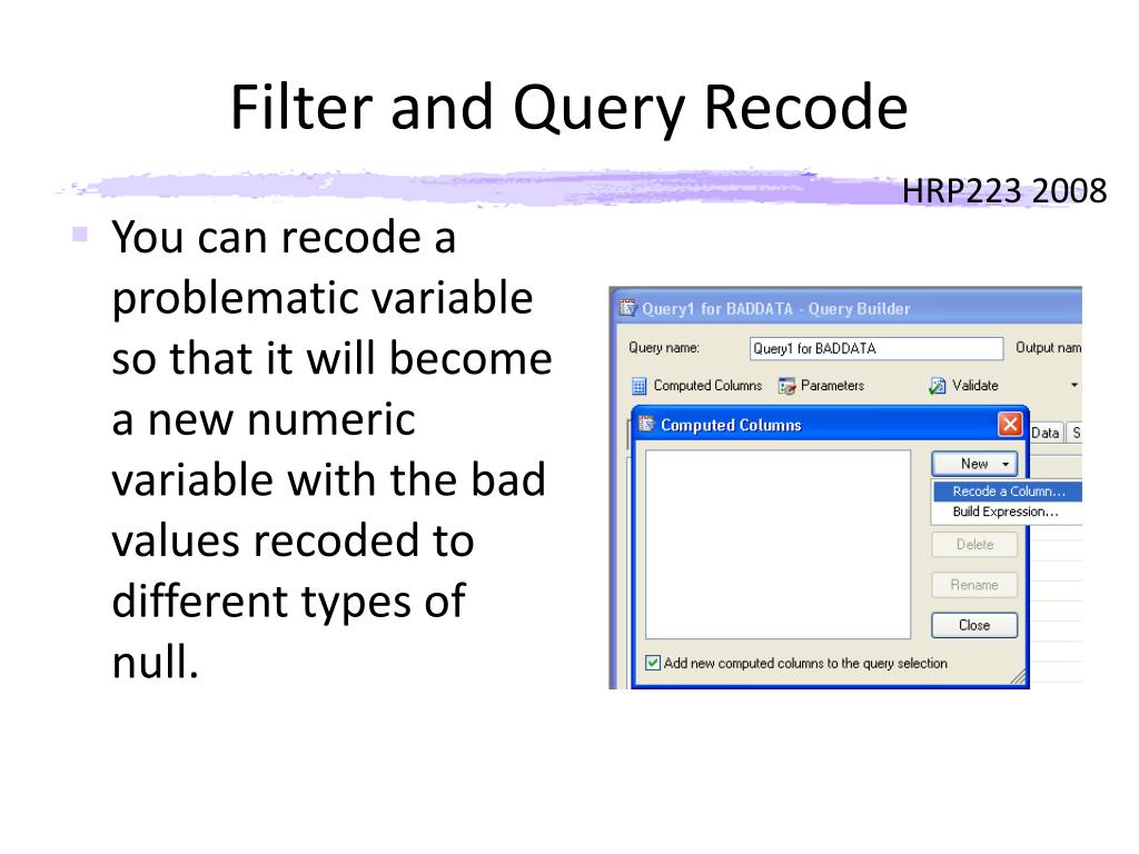 Filter and Query Recode You can recode a problematic variable so that it will become a new numeric variable with the bad values recoded to different types of null.