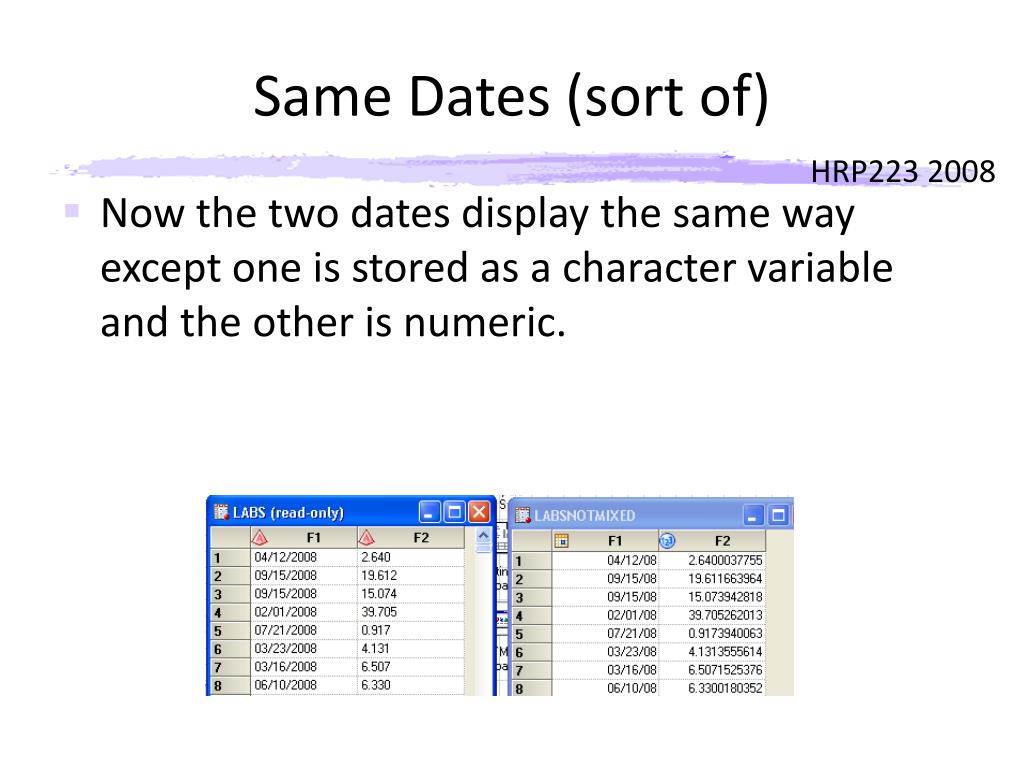 Same Dates (sort of) Now the two dates display the same way except one is stored as a character variable and the other is numeric.