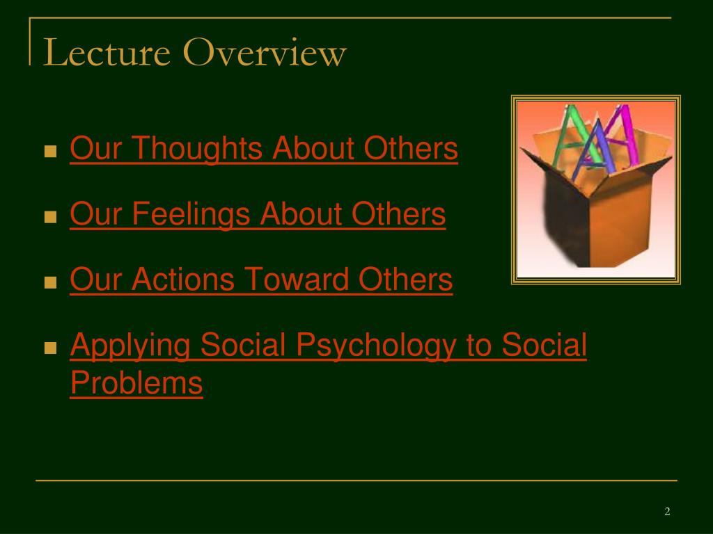 Lecture Overview • Our Thoughts About Others • Our Feelings About Others • Our Actions Toward Others • Applying Social Psychology to Social Problems
