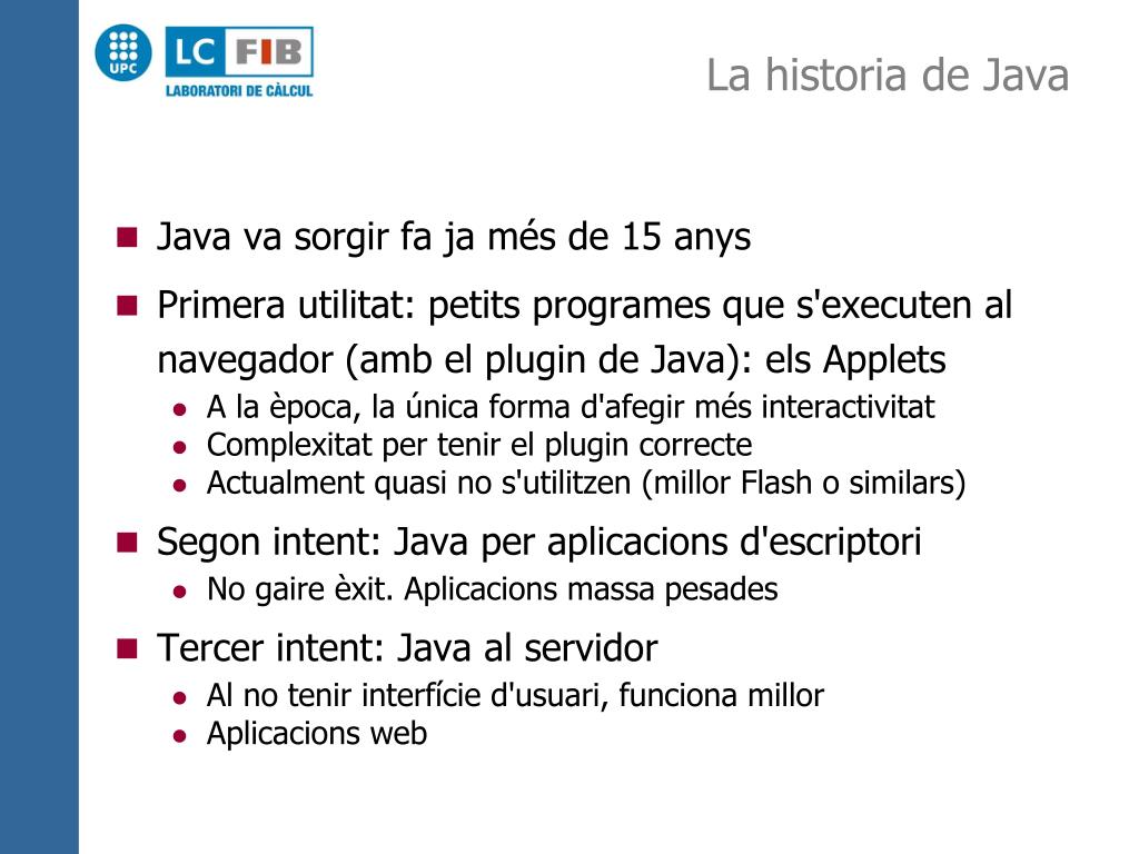 La historia de Java • Java va sorgir fa ja més de 15 anys • Primera utilitat: petits programes que s'executen al navegador (amb el plugin de Java): els Applets • A la època, la única forma d'afegir més interactivitat • Complexitat per tenir el plugin correcte • Actualment quasi no s'utilitzen (millor Flash o similars) • Segon intent: Java per aplicacions d'escriptori • No gaire èxit. Aplicacions massa pesades • Tercer intent: Java al servidor • Al no tenir interfície d'usuari, funciona millor • Aplicacions web
