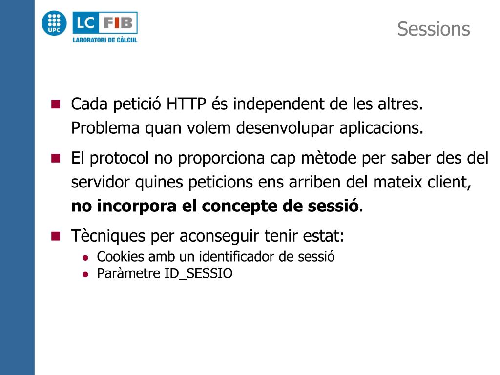 Sessions • Cada petició HTTP és independent de les altres. Problema quan volem desenvolupar aplicacions. • El protocol no proporciona cap mètode per saber des del servidor quines peticions ens arriben del mateix client, no incorpora el concepte de sessió. • Tècniques per aconseguir tenir estat: • Cookies amb un identificador de sessió • Paràmetre ID_SESSIO