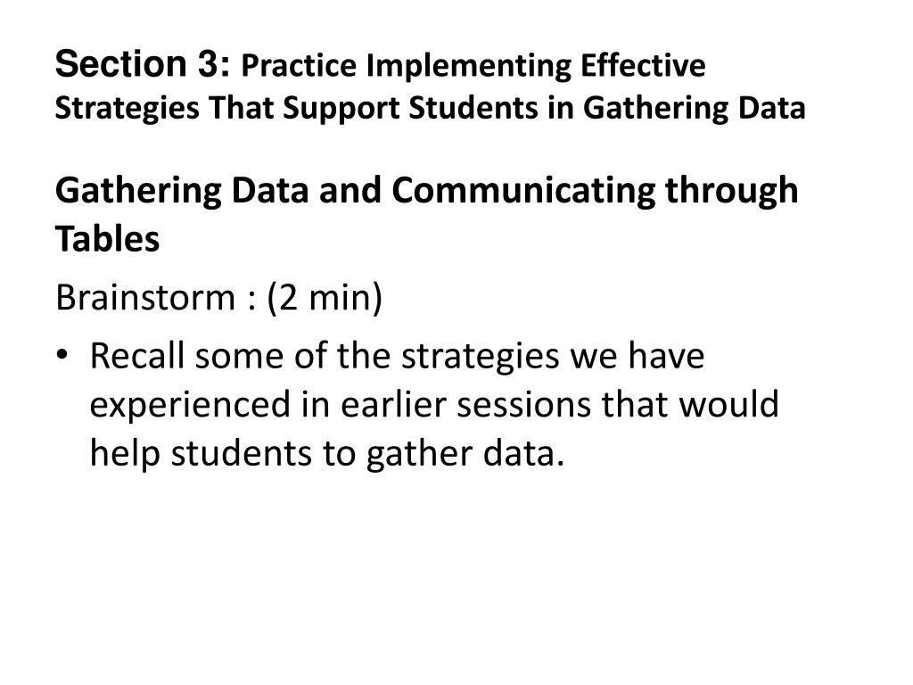 Section 3: Practice Implementing Effective Strategies That Support Students in Gathering Data Gathering Data and Communicating through Tables Brainstorm : (2 min) • Recall some of the strategies we have experienced in earlier sessions that would help students to gather data.
