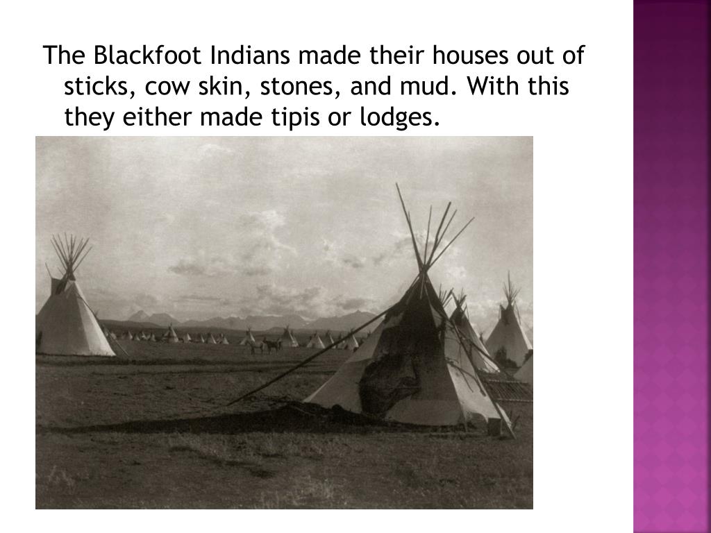 The Blackfoot Indians made their houses out of sticks, cow skin, stones, and mud. With this they either made tipis or lodges.