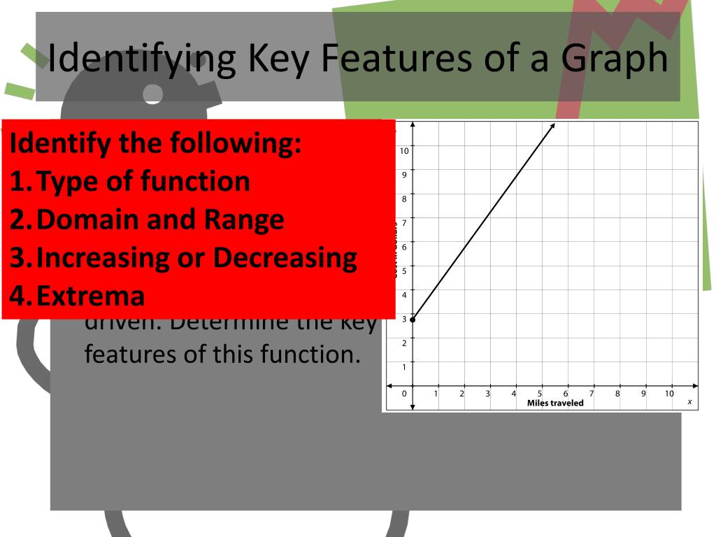 Identifying Key Features of a Graph Identify the following: Type of function Domain and Range Increasing or Decreasing Extrema Guided Practice Example 1 • A taxi company in Atlanta charges $2.75 per ride plus $1.50 for every mile driven. Determine the key features of this function.
