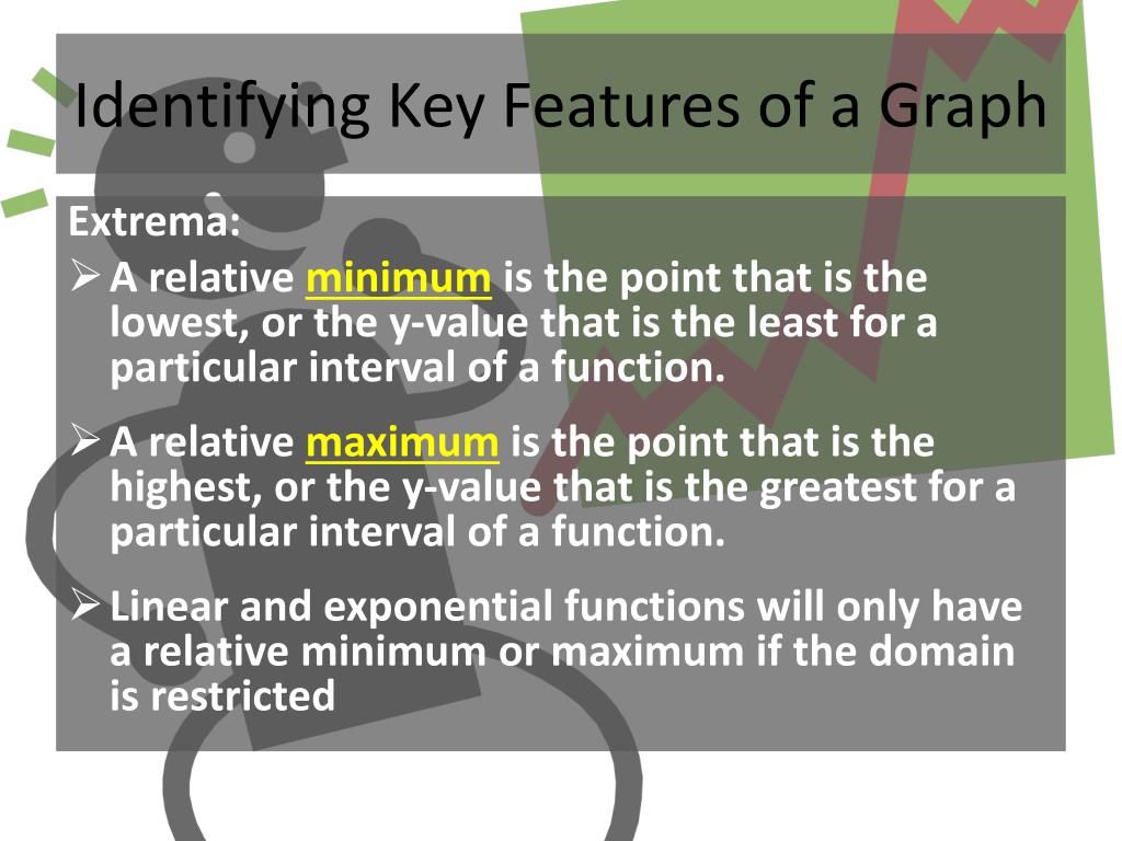 Identifying Key Features of a Graph Extrema: • A relative minimum is the point that is the lowest, or the y-value that is the least for a particular interval of a function. • A relative maximum is the point that is the highest, or the y-value that is the greatest for a particular interval of a function. • Linear and exponential functions will only have a relative minimum or maximum if the domain is restricted