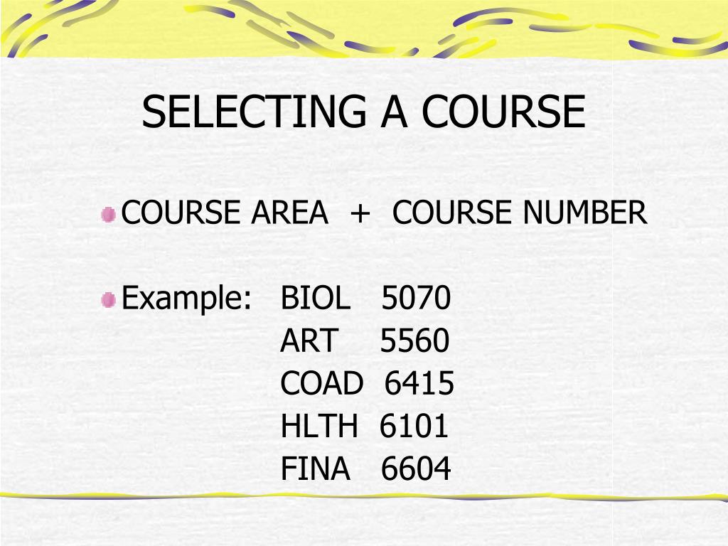 SELECTING A COURSE • COURSE AREA + COURSE NUMBER • Example: BIOL 5070 ART 5560 COAD 6415 HLTH 6101 FINA 6604