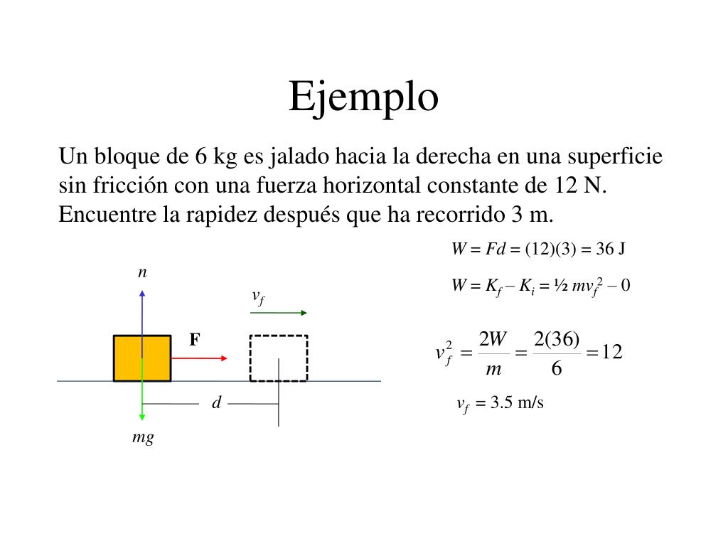 Ejemplo Un bloque de 6 kg es jalado hacia la derecha en una superficie sin fricción con una fuerza horizontal constante de 12 N. Encuentre la rapidez después que ha recorrido 3 m. W = Fd = (12)(3) = 36 J W = Kf – Ki = ½ mvf2 – 0 n vf F d vf = 3.5 m/s mg
