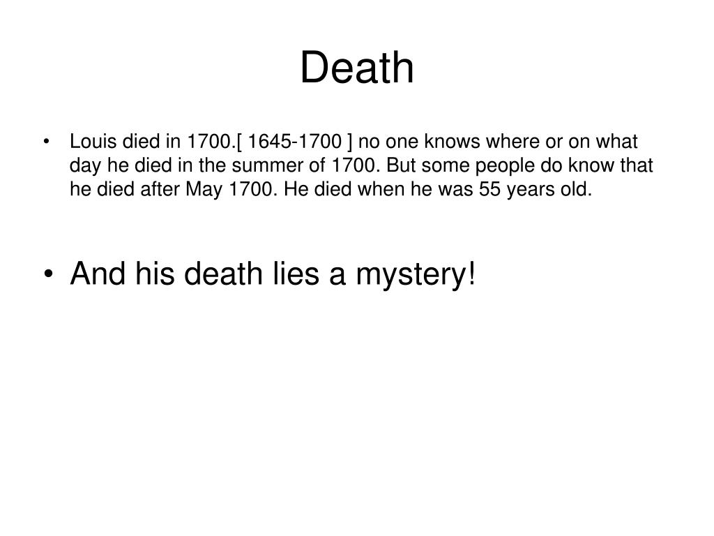 Death • Louis died in 1700.[ 1645-1700 ] no one knows where or on what day he died in the summer of 1700. But some people do know that he died after May 1700. He died when he was 55 years old. • And his death lies a mystery!