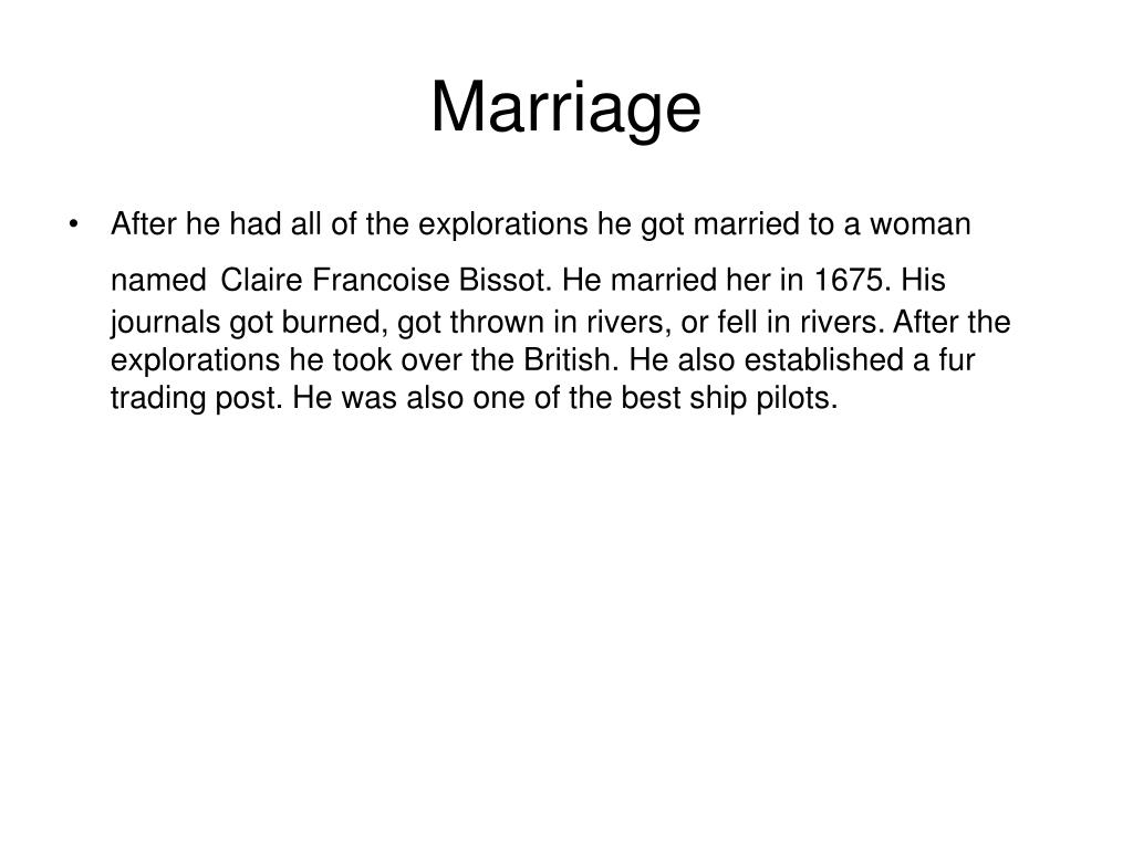 Marriage • After he had all of the explorations he got married to a woman namedClaire Francoise Bissot. He married her in 1675. His journals got burned, got thrown in rivers, or fell in rivers. After the explorations he took over the British. He also established a fur trading post. He was also one of the best ship pilots.