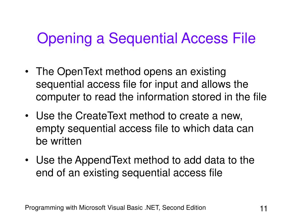 Sequential Access FilesLesson A Objectives (continued) • Read information from a sequential access file • Determine whether the computer has finished reading a sequential access file • Close a sequential access file Programming with Microsoft Visual Basic .NET, Second Edition
