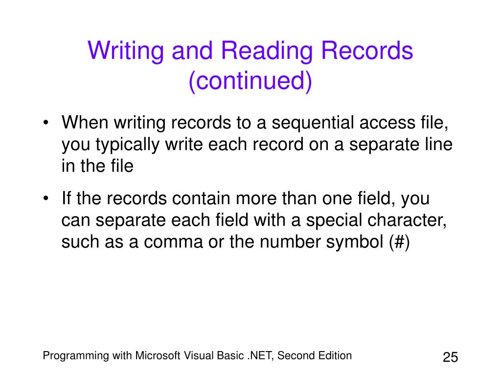 Writing and Reading Records (continued) • When writing records to a sequential access file, you typically write each record on a separate line in the file • If the records contain more than one field, you can separate each field with a special character, such as a comma or the number symbol (#) Programming with Microsoft Visual Basic .NET, Second Edition