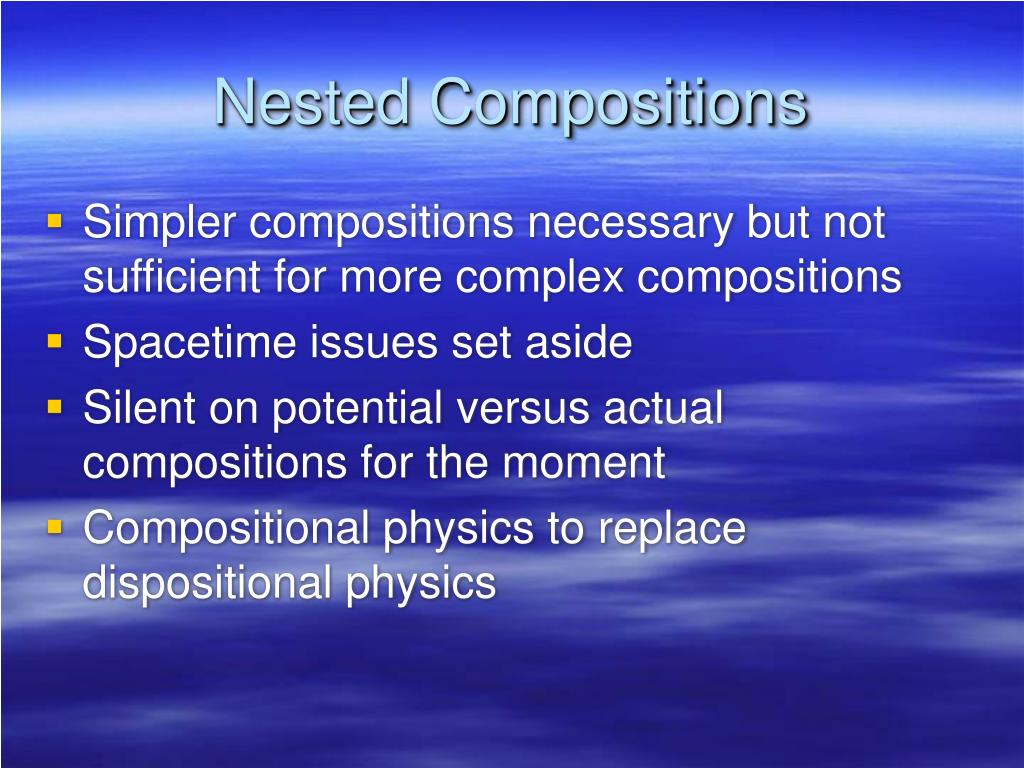 Nested Compositions • Simpler compositions necessary but not sufficient for more complex compositions • Spacetime issues set aside • Silent on potential versus actual compositions for the moment • Compositional physics to replace dispositional physics