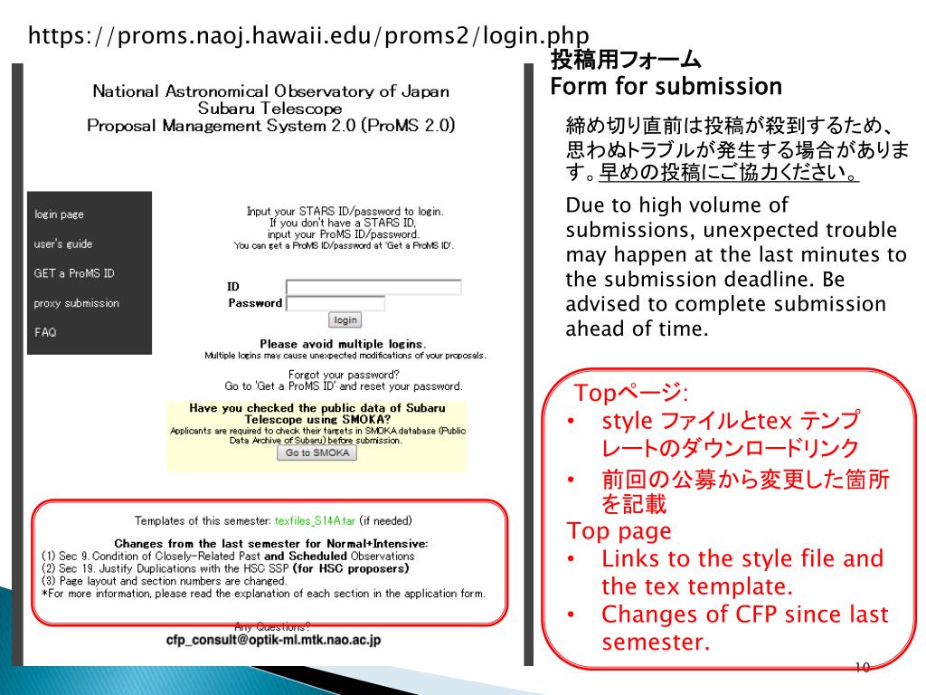 https://proms.naoj.hawaii.edu/proms2/login.php 投稿用フォームForm for submission 締め切り直前は投稿が殺到するため、思わぬトラブルが発生する場合があります。早めの投稿にご協力ください。 Due to high volume of submissions, unexpected trouble may happen at the last minutes to the submission deadline. Be advised to complete submissionahead of time. Topページ: • style ファイルとtexテンプレートのダウンロードリンク • 前回の公募から変更した箇所を記載 • Top page • Links to the style file and the tex template. • Changes of CFP since last semester.