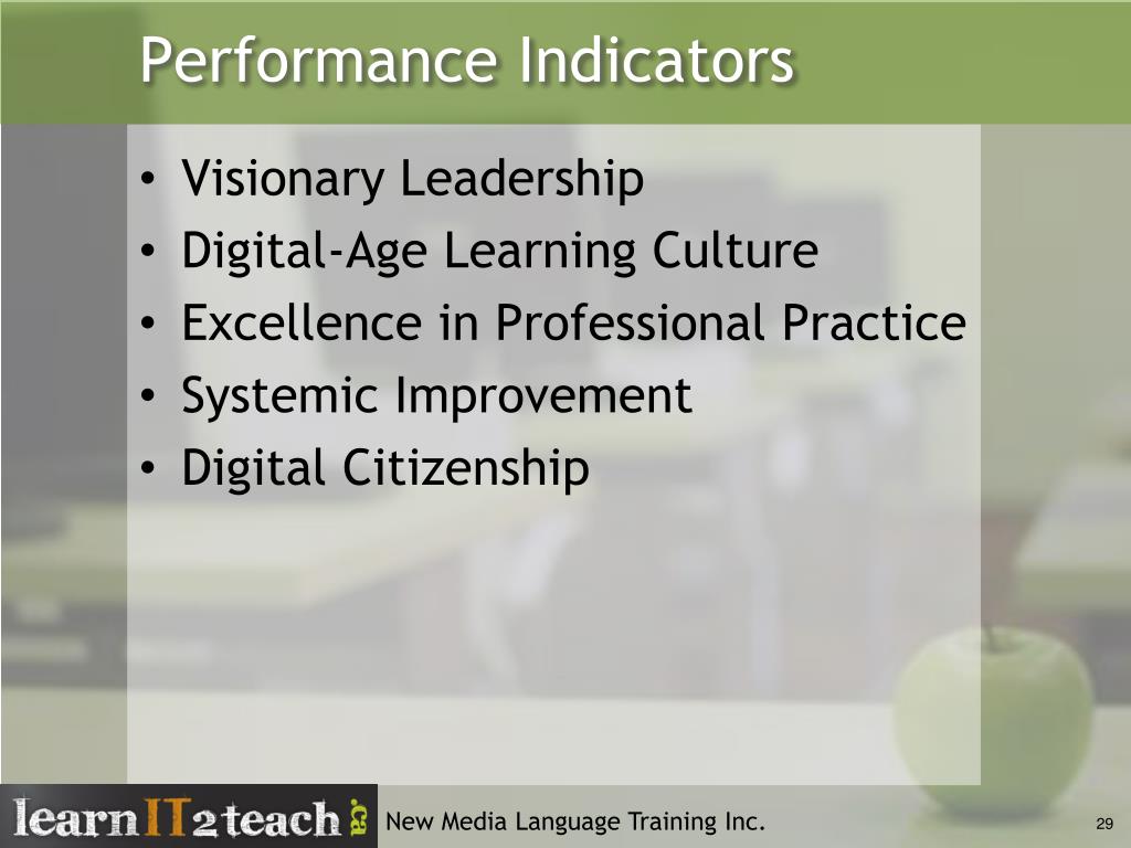 Performance Indicators • Visionary Leadership • Digital-Age Learning Culture • Excellence in Professional Practice • Systemic Improvement • Digital Citizenship