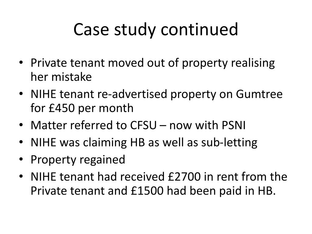Case study continued • Private tenant moved out of property realising her mistake • NIHE tenant re-advertised property on Gumtree for £450 per month • Matter referred to CFSU – now with PSNI • NIHE was claiming HB as well as sub-letting • Property regained • NIHE tenant had received £2700 in rent from the Private tenant and £1500 had been paid in HB.
