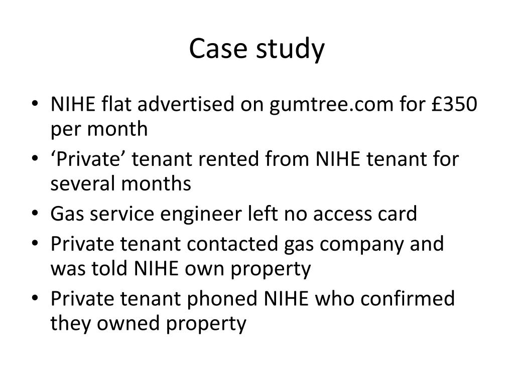 Case study • NIHE flat advertised on gumtree.com for £350 per month • ‘Private’ tenant rented from NIHE tenant for several months • Gas service engineer left no access card • Private tenant contacted gas company and was told NIHE own property • Private tenant phoned NIHE who confirmed they owned property