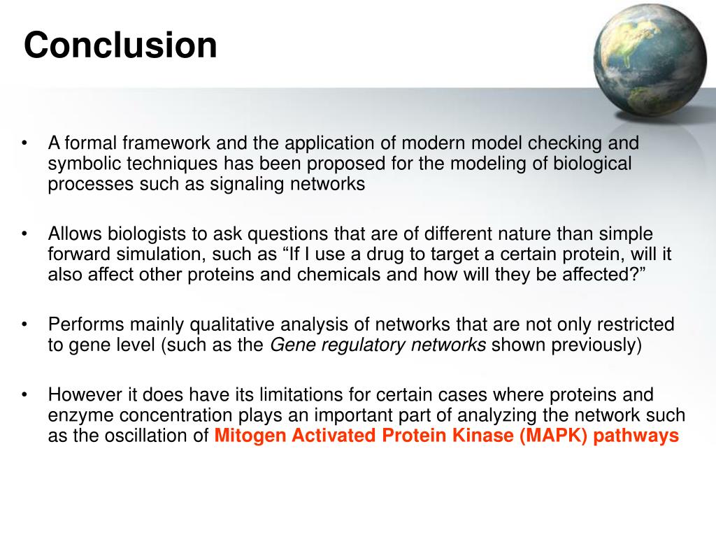 Conclusion • A formal framework and the application of modern model checking and symbolic techniques has been proposed for the modeling of biological processes such as signaling networks • Allows biologists to ask questions that are of different nature than simple forward simulation, such as “If I use a drug to target a certain protein, will it also affect other proteins and chemicals and how will they be affected?” • Performs mainly qualitative analysis of networks that are not only restricted to gene level (such as the Gene regulatory networks shown previously) • However it does have its limitations for certain cases where proteins and enzyme concentration plays an important part of analyzing the network such as the oscillation of Mitogen Activated Protein Kinase (MAPK) pathways
