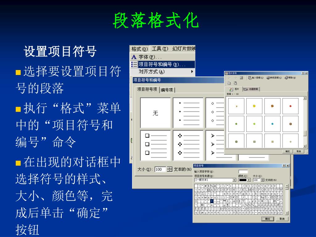 段落格式化 设置项目符号 • 选择要设置项目符号的段落 • 执行“格式”菜单中的“项目符号和编号”命令 • 在出现的对话框中选择符号的样式、大小、颜色等,完成后单击“确定”按钮