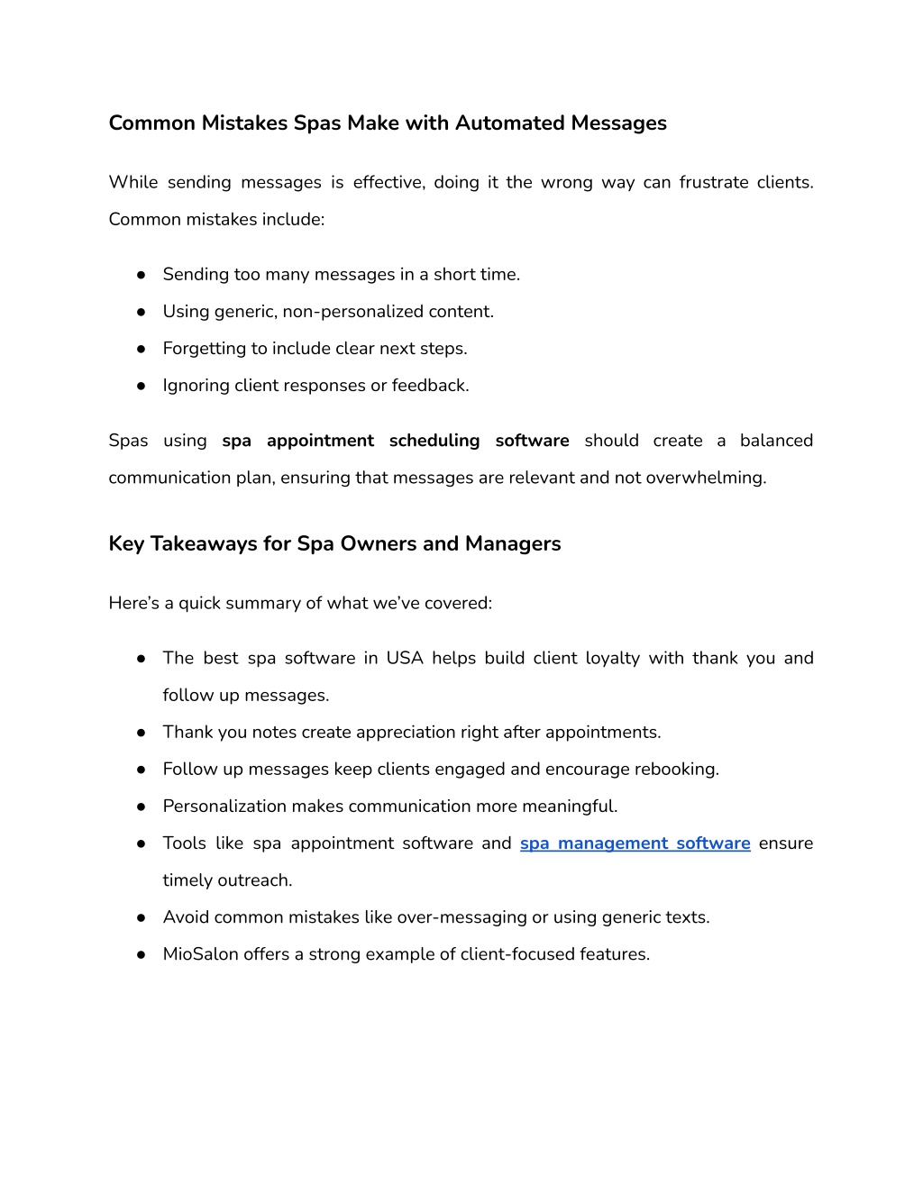 Common Mistakes Spas Make with Automated Messages While sending messages is effective, doing it the wrong way can frustrate clients. Common mistakes include: ● Sending too many messages in a short time. ● Using generic, non-personalized content. ● Forgetting to include clear next steps. ● Ignoring client responses or feedback. Spas using spa appointment scheduling software should create a balanced communication plan, ensuring that messages are relevant and not overwhelming. Key Takeaways for Spa Owners and Managers Here’s a quick summary of what we’ve covered: ● The best spa software in USA helps build client loyalty with thank you and follow up messages. ● Thank you notes create appreciation right after appointments. ● Follow up messages keep clients engaged and encourage rebooking. ● Personalization makes communication more meaningful. ● Tools like spa appointment software and spa management software ensure timely outreach. ● Avoid common mistakes like over-messaging or using generic texts. ● MioSalon offers a strong example of client-focused features.