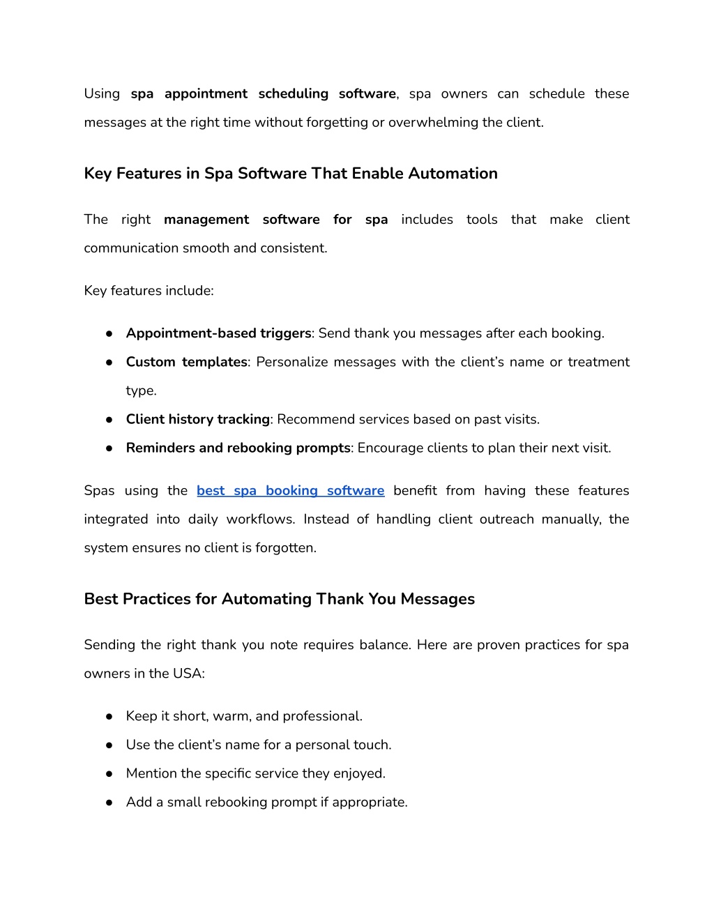 Using spa appointment scheduling software, spa owners can schedule these messages at the right time without forgetting or overwhelming the client. Key Features in Spa Software That Enable Automation The right management software for spa includes tools that make client communication smooth and consistent. Key features include: ● Appointment-based triggers: Send thank you messages after each booking. ● Custom templates: Personalize messages with the client’s name or treatment type. ● Client history tracking: Recommend services based on past visits. ● Reminders and rebooking prompts: Encourage clients to plan their next visit. Spas using the best spa booking software benefit from having these features integrated into daily workflows. Instead of handling client outreach manually, the system ensures no client is forgotten. Best Practices for Automating Thank You Messages Sending the right thank you note requires balance. Here are proven practices for spa owners in the USA: ● Keep it short, warm, and professional. ● Use the client’s name for a personal touch. ● Mention the specific service they enjoyed. ● Add a small rebooking prompt if appropriate.