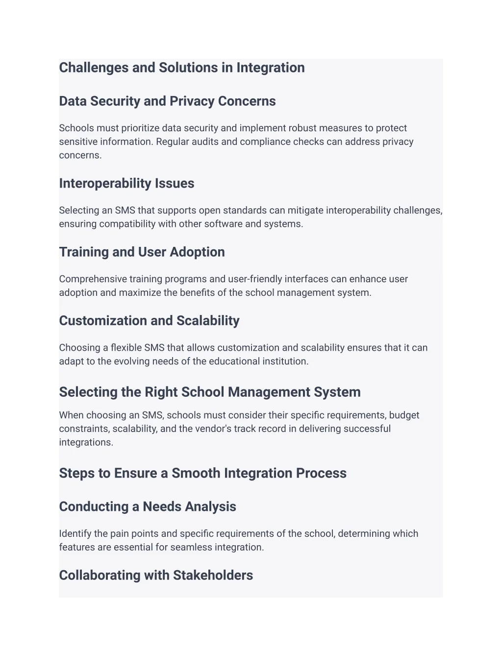 Challenges and Solutions in Integration Data Security and Privacy Concerns Schools must prioritize data security and implement robust measures to protect sensitive information. Regular audits and compliance checks can address privacy concerns. Interoperability Issues Selecting an SMS that supports open standards can mitigate interoperability challenges, ensuring compatibility with other software and systems. Training and User Adoption Comprehensive training programs and user-friendly interfaces can enhance user adoption and maximize the benefits of the school management system. Customization and Scalability Choosing a flexible SMS that allows customization and scalability ensures that it can adapt to the evolving needs of the educational institution. Selecting the Right School Management System When choosing an SMS, schools must consider their specific requirements, budget constraints, scalability, and the vendor's track record in delivering successful integrations. Steps to Ensure a Smooth Integration Process Conducting a Needs Analysis Identify the pain points and specific requirements of the school, determining which features are essential for seamless integration. Collaborating with Stakeholders