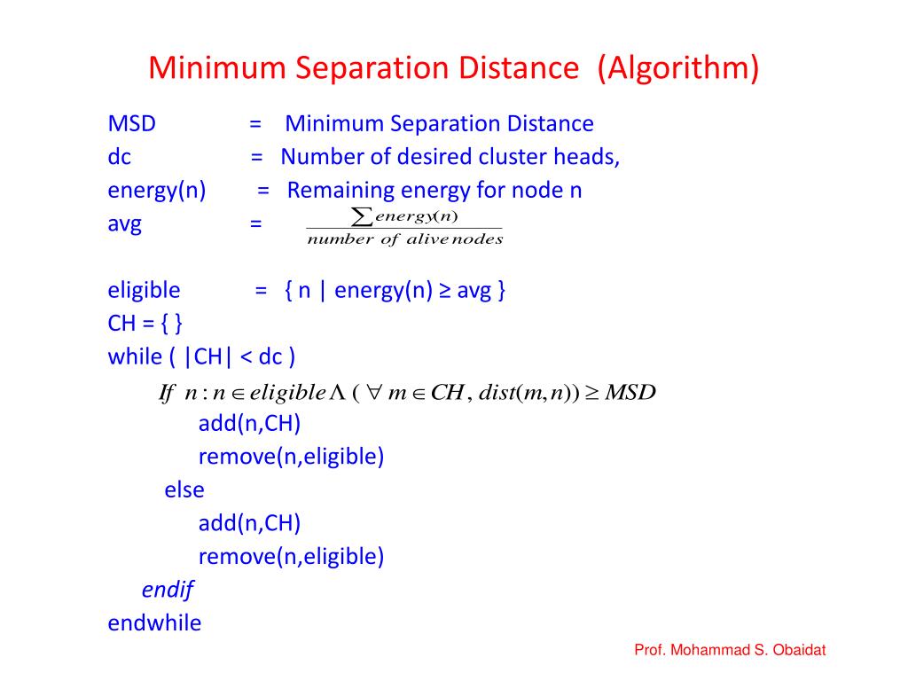 Minimum Separation Distance (Algorithm) MSD = Minimum Separation Distance dc = Number of desired cluster heads, energy(n) = Remaining energy for node n avg = eligible = { n | energy(n) ≥ avg } CH = { } while ( |CH| < dc ) add(n,CH) remove(n,eligible) else add(n,CH) remove(n,eligible) endif endwhile Prof. Mohammad S. Obaidat