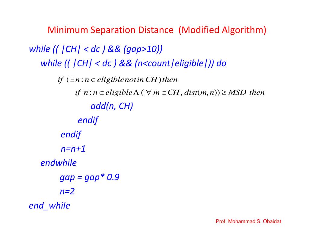 Minimum Separation Distance (Modified Algorithm) while (( |CH| < dc ) && (gap>10)) while (( |CH| < dc ) && (n<count|eligible|)) do add(n, CH) endif endif n=n+1 endwhile gap = gap* 0.9 n=2 end_while Prof. Mohammad S. Obaidat