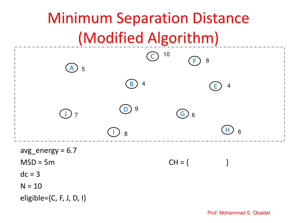 Minimum Separation Distance (Modified Algorithm) 10 C 8 F A 5 4 B 4 E 9 D J G 7 6 H 6 I 8 avg_energy = 6.7 MSD = 5m CH = { } dc = 3 N = 10 eligible={C, F, J, D, I} Prof. Mohammad S. Obaidat