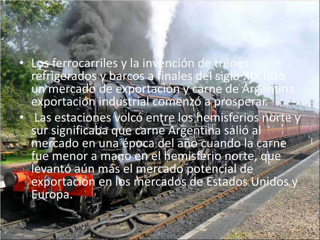 Los ferrocarriles y la invención de trenes refrigerados y barcos a finales del siglo XIX hizo un mercado de exportación y carne de Argentina exportación industrial comenzó a prosperar. • Las estaciones volcó entre los hemisferios norte y sur significaba que carne Argentina salió al mercado en una época del año cuando la carne fue menor a mano en el hemisferio norte, que levantó aún más el mercado potencial de exportación en los mercados de Estados Unidos y Europa.
