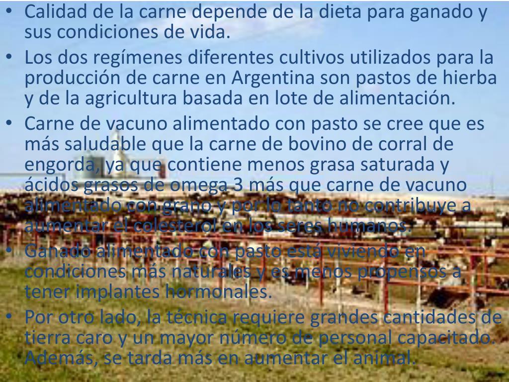 Calidad de la carne depende de la dieta para ganado y sus condiciones de vida. • Los dos regímenes diferentes cultivos utilizados para la producción de carne en Argentina son pastos de hierba y de la agricultura basada en lotede alimentación. • Carne de vacuno alimentado con pasto se cree que es más saludable que la carne de bovino de corral de engorda, ya que contiene menos grasa saturada y ácidos grasos de omega 3 más que carne de vacuno alimentado con grano y por lo tanto no contribuye a aumentar el colesterol en los seres humanos. • Ganado alimentado con pasto está viviendo en condiciones más naturales y es menos propensos a tener implantes hormonales. • Por otro lado, la técnica requiere grandes cantidades de tierra caro y un mayor número de personal capacitado. Además, se tarda más en aumentar el animal.