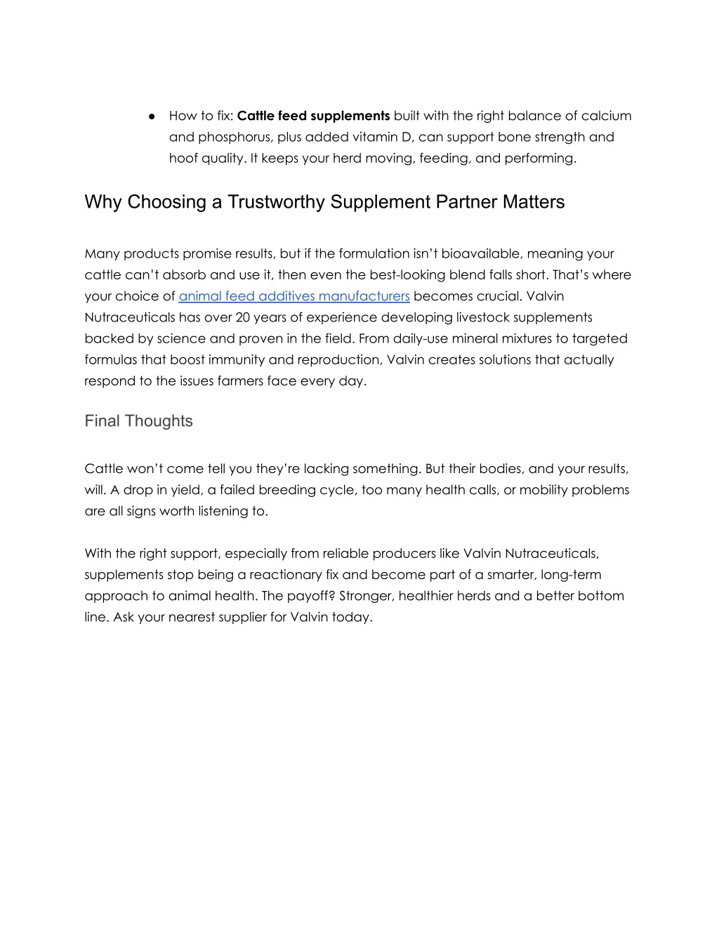 ● How to fix: Cattle feed supplements built with the right balance of calcium and phosphorus, plus added vitamin D, can support bone strength and hoof quality. It keeps your herd moving, feeding, and performing. Why Choosing a Trustworthy Supplement Partner Matters Many products promise results, but if the formulation isn’t bioavailable, meaning your cattle can’t absorb and use it, then even the best-looking blend falls short. That’s where your choice of animal feed additives manufacturers becomes crucial. Valvin Nutraceuticals has over 20 years of experience developing livestock supplements backed by science and proven in the field. From daily-use mineral mixtures to targeted formulas that boost immunity and reproduction, Valvin creates solutions that actually respond to the issues farmers face every day. Final Thoughts Cattle won’t come tell you they’re lacking something. But their bodies, and your results, will. A drop in yield, a failed breeding cycle, too many health calls, or mobility problems are all signs worth listening to. With the right support, especially from reliable producers like Valvin Nutraceuticals, supplements stop being a reactionary fix and become part of a smarter, long-term approach to animal health. The payoff? Stronger, healthier herds and a better bottom line. Ask your nearest supplier for Valvin today.