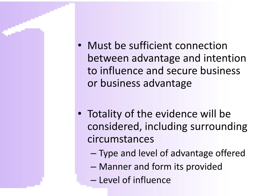 Must be sufficient connection between advantage and intention to influence and secure business or business advantage • Totality of the evidence will be considered, including surrounding circumstances • Type and level of advantage offered • Manner and form its provided • Level of influence