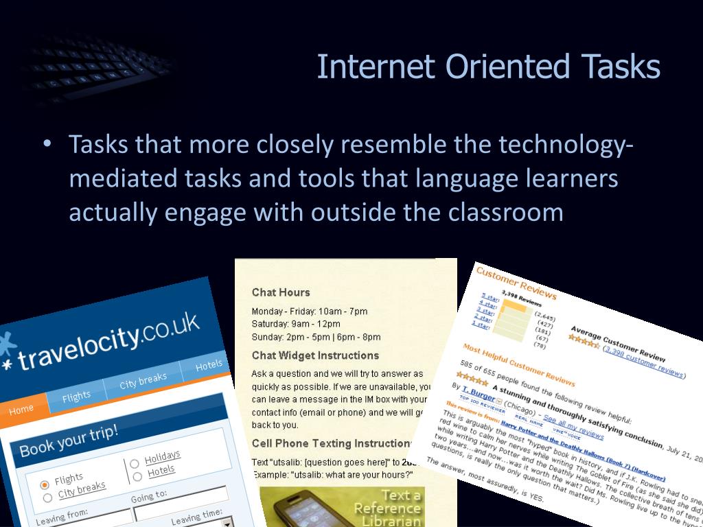 Internet Oriented Tasks • Tasks that more closely resemble the technology-mediated tasks and tools that language learners actually engage with outside the classroom