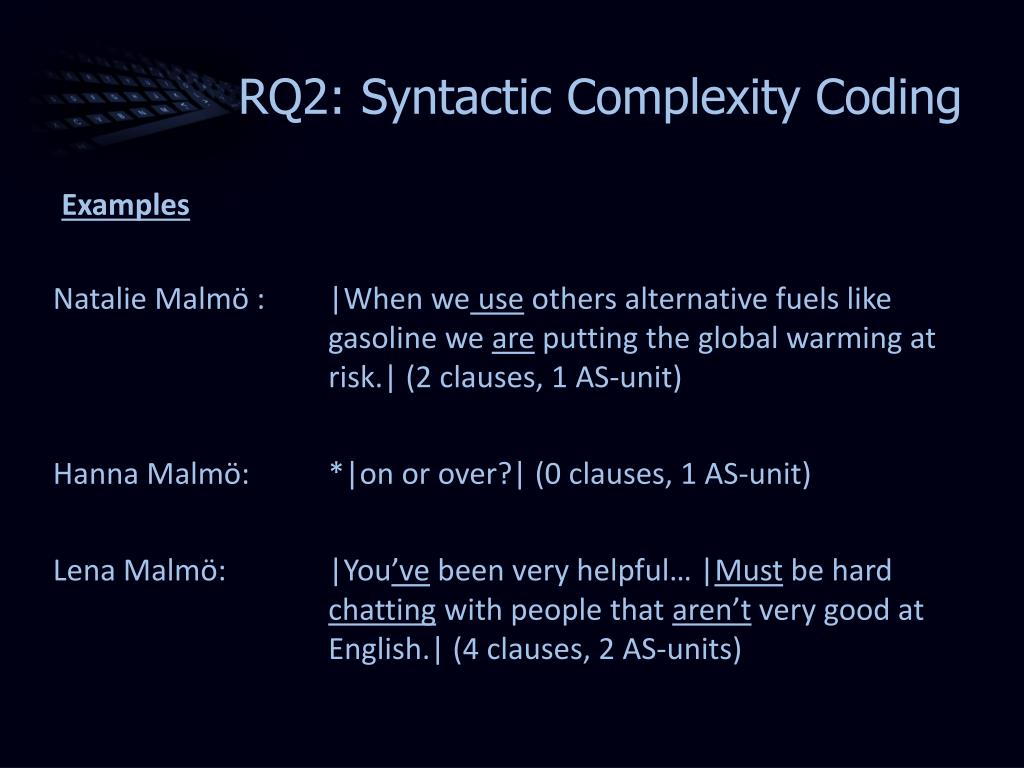 RQ2: Determining Syntactic Complexity • Analysis of Speech Unit (AS-unit): • “a single speaker’s utterance consisting of an independent clause or sub-clausal unit with any subordinate clause(s) associated with either” (Foster, Tonkyn & Wigglesworth, 2000, p. 365) • Clause: • “a finite or non-finite verb element plus at least one other clause element (Subject, Object, Complement or Adverbial)” (p.366) • Measure of Complexity: • Ratio of clauses (independent and subordinate) to AS-units