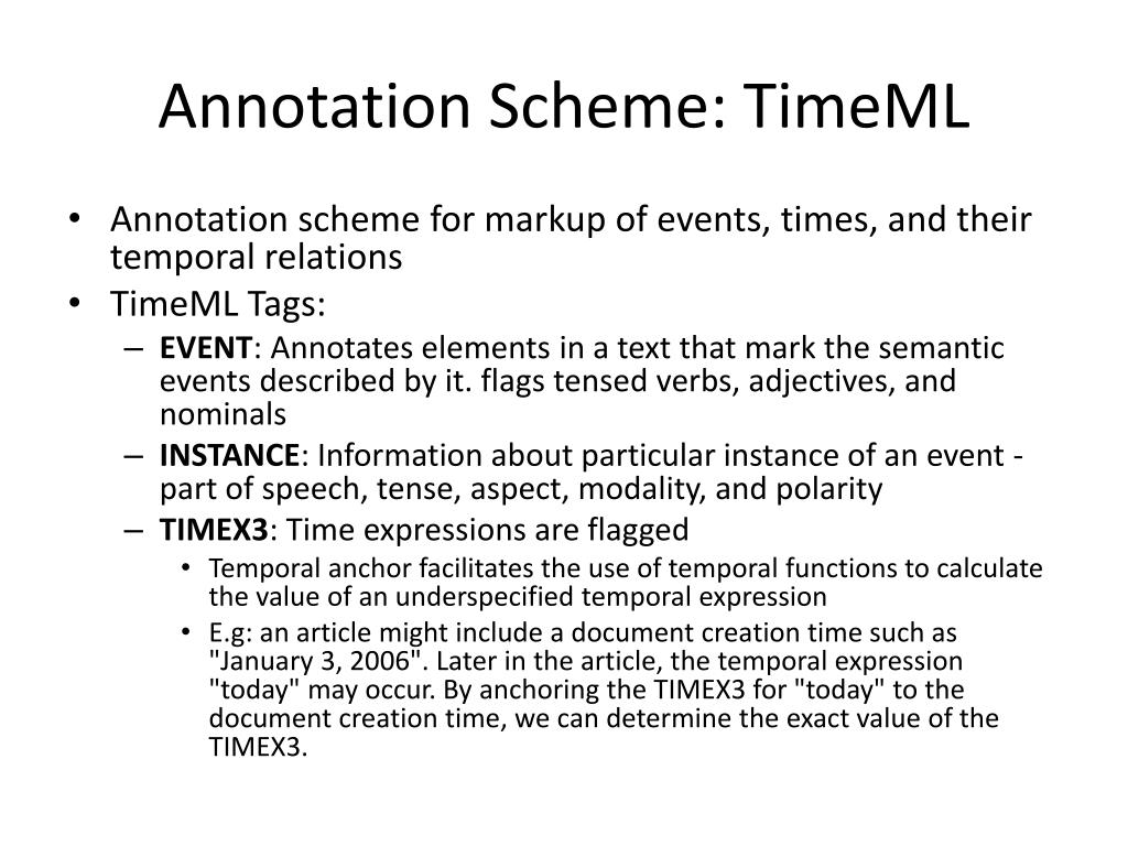 Annotation Scheme: TimeML • Annotation scheme for markup of events, times, and their temporal relations • TimeML Tags: • EVENT: Annotates elements in a text that mark the semantic events described by it. flags tensed verbs, adjectives, and nominals • INSTANCE: Information about particular instance of an event - part of speech, tense, aspect, modality, and polarity • TIMEX3: Time expressions are flagged • Temporal anchor facilitates the use of temporal functions to calculate the value of an underspecified temporal expression • E.g: an article might include a document creation time such as "January 3, 2006". Later in the article, the temporal expression "today" may occur. By anchoring the TIMEX3 for "today" to the document creation time, we can determine the exact value of the TIMEX3.