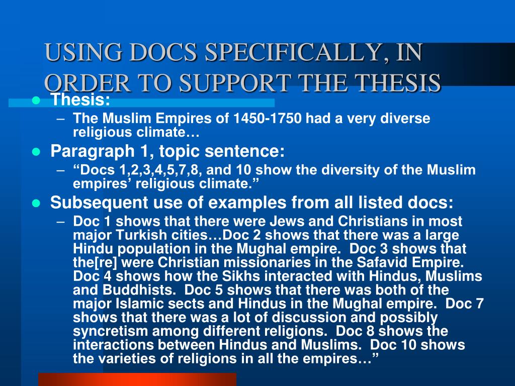 USING DOCS SPECIFICALLY, IN ORDER TO SUPPORT THE THESIS • Thesis: • The Muslim Empires of 1450-1750 had a very diverse religious climate… • Paragraph 1, topic sentence: • “Docs 1,2,3,4,5,7,8, and 10 show the diversity of the Muslim empires’ religious climate.” • Subsequent use of examples from all listed docs: • Doc 1 shows that there were Jews and Christians in most major Turkish cities…Doc 2 shows that there was a large Hindu population in the Mughal empire. Doc 3 shows that the[re] were Christian missionaries in the Safavid Empire. Doc 4 shows how the Sikhs interacted with Hindus, Muslims and Buddhists. Doc 5 shows that there was both of the major Islamic sects and Hindus in the Mughal empire. Doc 7 shows that there was a lot of discussion and possibly syncretism among different religions. Doc 8 shows the interactions between Hindus and Muslims. Doc 10 shows the varieties of religions in all the empires…”