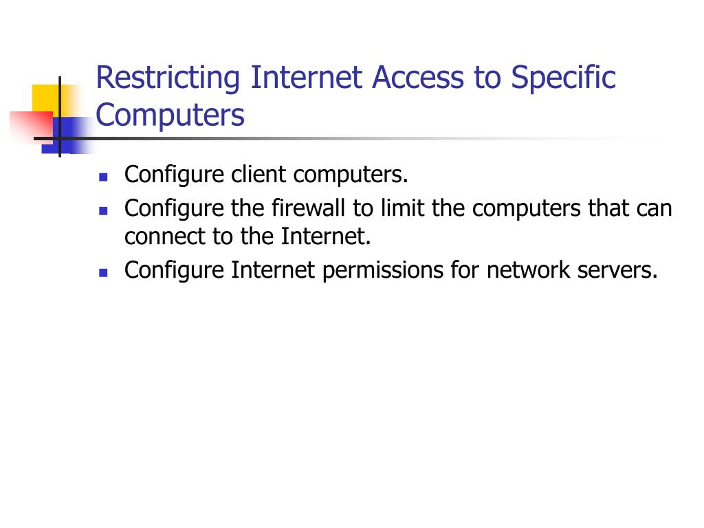 Restricting Internet Access to Specific Computers • Configure client computers. • Configure the firewall to limit the computers that can connect to the Internet. • Configure Internet permissions for network servers.