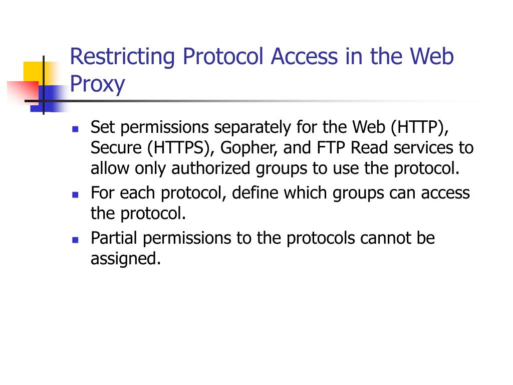 Restricting Protocol Access in the Web Proxy • Set permissions separately for the Web (HTTP), Secure (HTTPS), Gopher, and FTP Read services to allow only authorized groups to use the protocol. • For each protocol, define which groups can access the protocol. • Partial permissions to the protocols cannot be assigned.