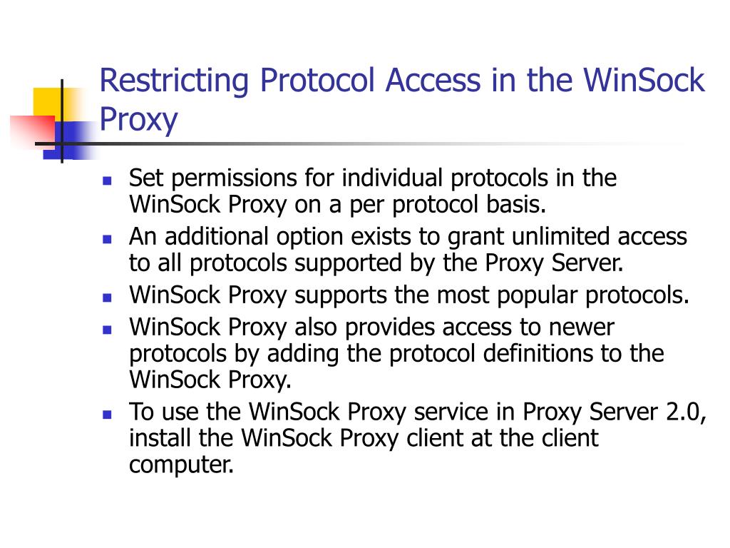 Restricting Protocol Access in the WinSock Proxy • Set permissions for individual protocols in the WinSock Proxy on a per protocol basis. • An additional option exists to grant unlimited access to all protocols supported by the Proxy Server. • WinSock Proxy supports the most popular protocols. • WinSock Proxy also provides access to newer protocols by adding the protocol definitions to the WinSock Proxy. • To use the WinSock Proxy service in Proxy Server 2.0, install the WinSock Proxy client at the client computer.