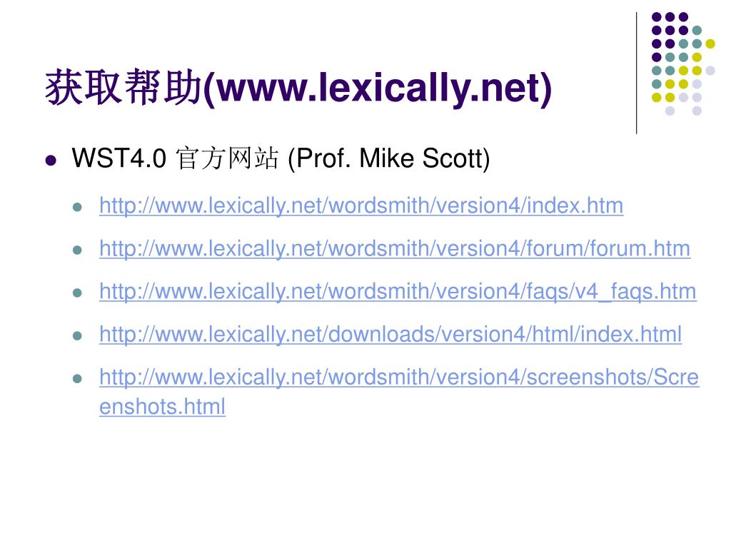 获取帮助(www.lexically.net) • WST4.0 官方网站 (Prof. Mike Scott) • http://www.lexically.net/wordsmith/version4/index.htm • http://www.lexically.net/wordsmith/version4/forum/forum.htm • http://www.lexically.net/wordsmith/version4/faqs/v4_faqs.htm • http://www.lexically.net/downloads/version4/html/index.html • http://www.lexically.net/wordsmith/version4/screenshots/Screenshots.html