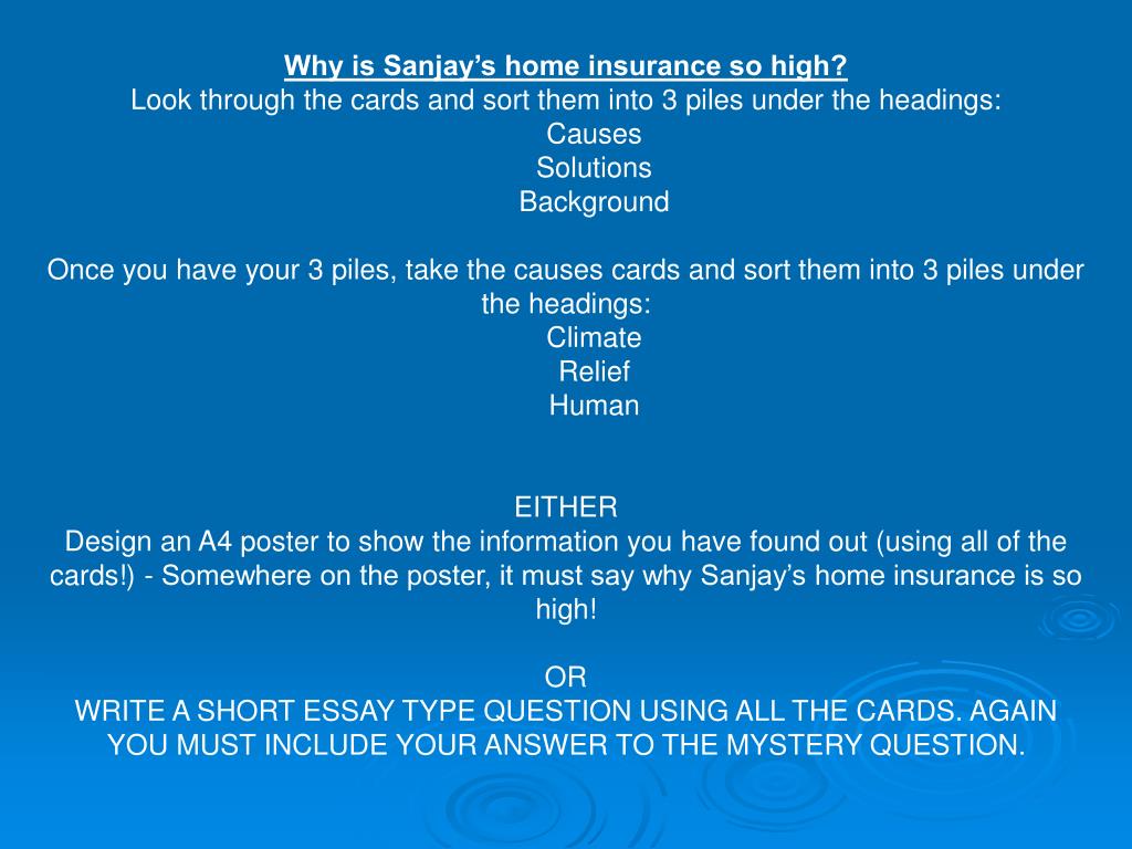 Why is Sanjay’s home insurance so high? • Look through the cards and sort them into 3 piles under the headings: • Causes • Solutions • Background • Once you have your 3 piles, take the causes cards and sort them into 3 piles under the headings: • Climate • Relief • Human • EITHER • Design an A4 poster to show the information you have found out (using all of the cards!) - Somewhere on the poster, it must say why Sanjay’s home insurance is so high! • OR • WRITE A SHORT ESSAY TYPE QUESTION USING ALL THE CARDS. AGAIN YOU MUST INCLUDE YOUR ANSWER TO THE MYSTERY QUESTION.