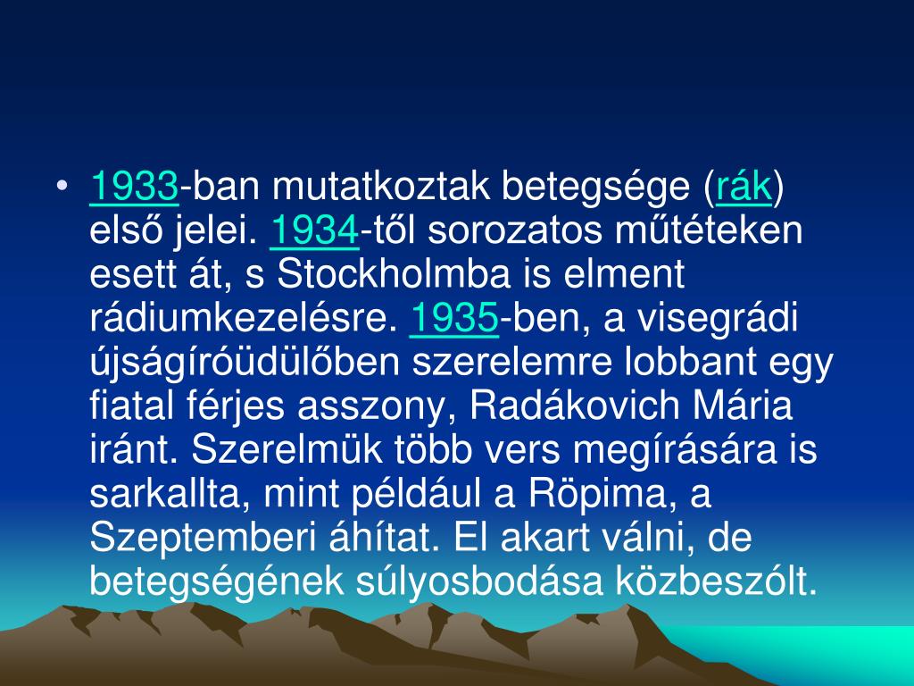 1933-ban mutatkoztak betegsége (rák) első jelei. 1934-től sorozatos műtéteken esett át, s Stockholmba is elment rádiumkezelésre. 1935-ben, a visegrádi újságíróüdülőben szerelemre lobbant egy fiatal férjes asszony, Radákovich Mária iránt. Szerelmük több vers megírására is sarkallta, mint például a Röpima, a Szeptemberi áhítat. El akart válni, de betegségének súlyosbodása közbeszólt.