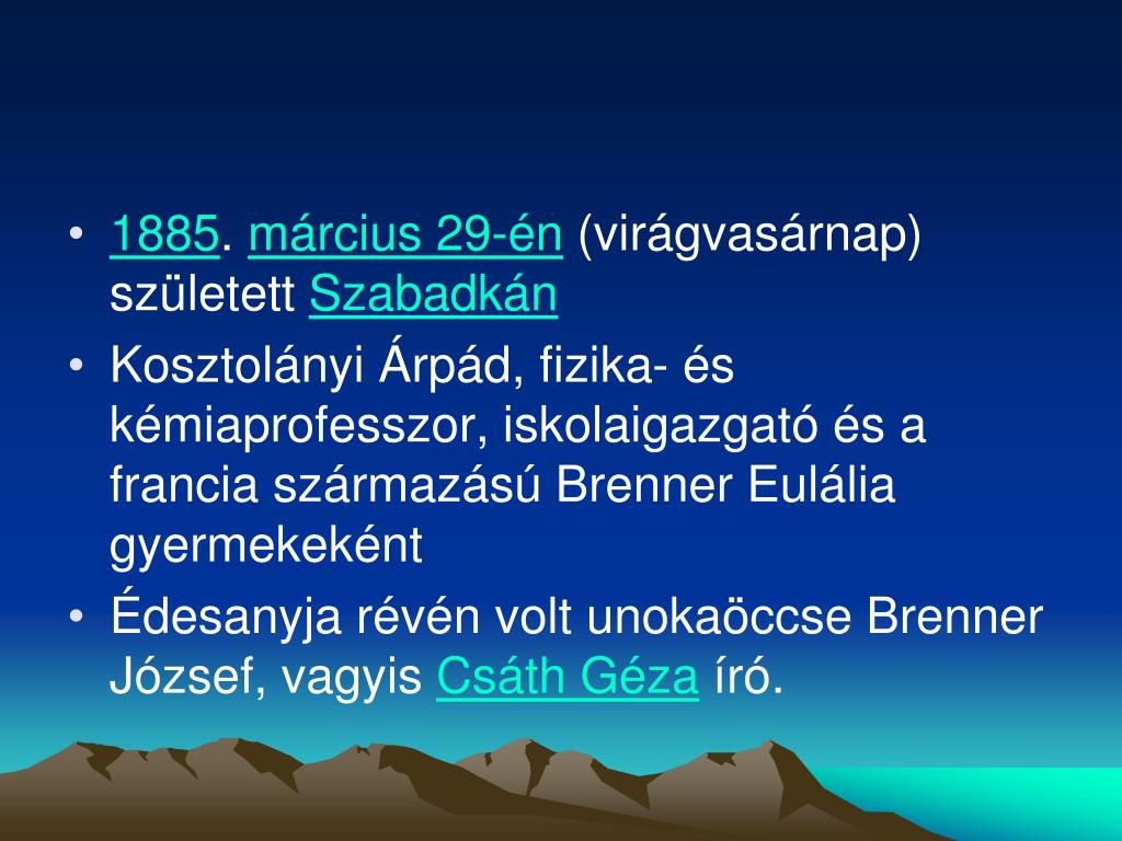 Kosztolányi Dezső. 1855-1936. 1885 . március 29-én (virágvasárnap) született Szabadkán Kosztolányi Árpád, fizika- és kémiaprofesszor, iskolaigazgató és a francia származású Brenner Eulália gyermekeként Édesanyja révén volt unokaöccse Brenner József, vagyis Csáth Géza író.