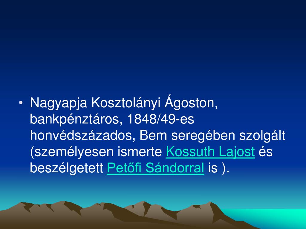 Nagyapja Kosztolányi Ágoston, bankpénztáros, 1848/49-es honvédszázados, Bem seregében szolgált (személyesen ismerte Kossuth Lajost és beszélgetett Petőfi Sándorral is ).