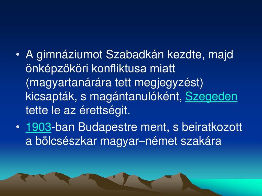 1904-ben beiratkozott a bécsi egyetemre, ahol Hegel filozófiájáról, Grillparzerről, Schillerről hallgatott szemináriumokat • 1905-ben hazatért, de nem ment vissza az egyetemre, hanem újságíró lett • Első cikkei többek közt a Szeged és Vidékében és a Bácskai Hírlapban jelentek meg
