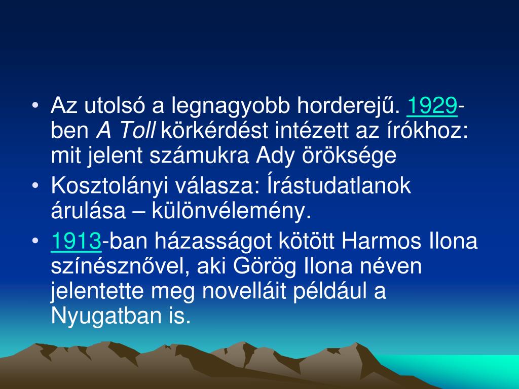 Az utolsó a legnagyobb horderejű. 1929-ben A Toll körkérdést intézett az írókhoz: mit jelent számukra Ady öröksége • Kosztolányi válasza: Írástudatlanok árulása – különvélemény. • 1913-ban házasságot kötött Harmos Ilona színésznővel, aki Görög Ilona néven jelentette meg novelláit például a Nyugatban is.