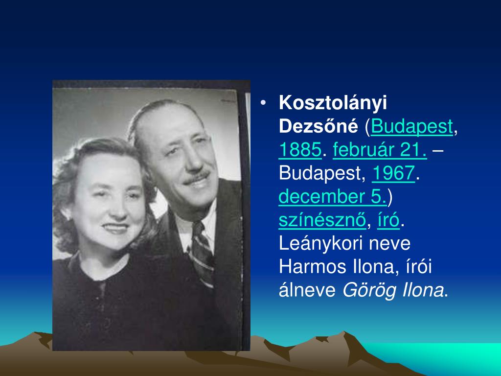 Kosztolányi Dezsőné (Budapest, 1885. február 21. – Budapest, 1967. december 5.) színésznő, író. Leánykori neve Harmos Ilona, írói álneve Görög Ilona.