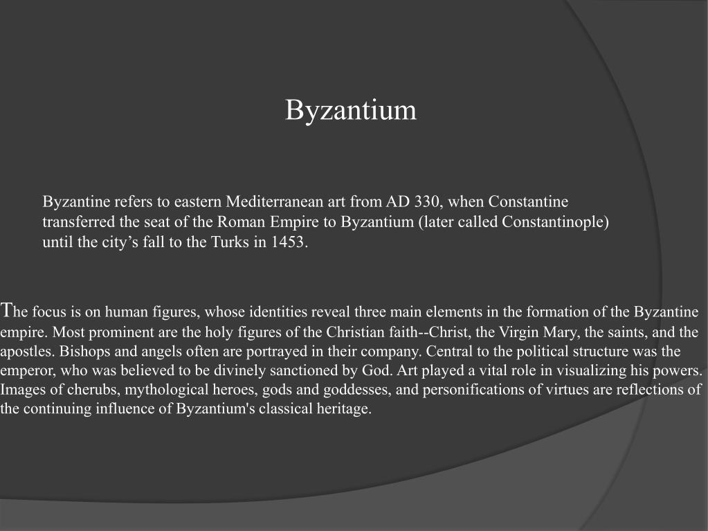 Byzantium Byzantine refers to eastern Mediterranean art from AD 330, when Constantine transferred the seat of the Roman Empire to Byzantium (later called Constantinople) until the city’s fall to the Turks in 1453. The focus is on human figures, whose identities reveal three main elements in the formation of the Byzantine empire. Most prominent are the holy figures of the Christian faith--Christ, the Virgin Mary, the saints, and the apostles. Bishops and angels often are portrayed in their company. Central to the political structure was the emperor, who was believed to be divinely sanctioned by God. Art played a vital role in visualizing his powers. Images of cherubs, mythological heroes, gods and goddesses, and personifications of virtues are reflections of the continuing influence of Byzantium's classical heritage.