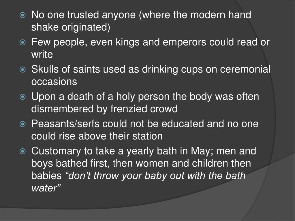No one trusted anyone (where the modern hand shake originated) • Few people, even kings and emperors could read or write • Skulls of saints used as drinking cups on ceremonial occasions • Upon a death of a holy person the body was often dismembered by frenzied crowd • Peasants/serfs could not be educated and no one could rise above their station • Customary to take a yearly bath in May; men and boys bathed first, then women and children then babies “don’t throw your baby out with the bath water”