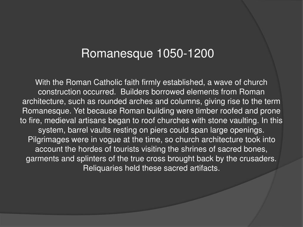 Romanesque 1050-1200 With the Roman Catholic faith firmly established, a wave of church construction occurred. Builders borrowed elements from Roman architecture, such as rounded arches and columns, giving rise to the term Romanesque. Yet because Roman building were timber roofed and prone to fire, medieval artisans began to roof churches with stone vaulting. In this system, barrel vaults resting on piers could span large openings. Pilgrimages were in vogue at the time, so church architecture took into account the hordes of tourists visiting the shrines of sacred bones, garments and splinters of the true cross brought back by the crusaders. Reliquaries held these sacred artifacts.